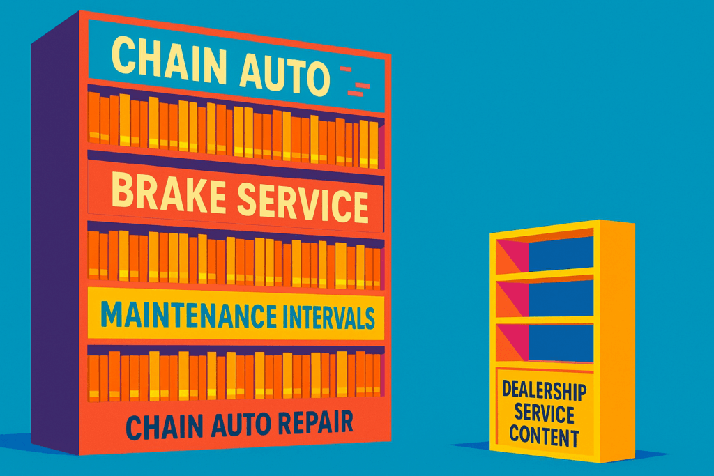 The reason is simple: chains dominate the conversation online. They have invested millions into building content that captures every question a customer might ask, while dealership websites usually feature only thin service pages with little depth.